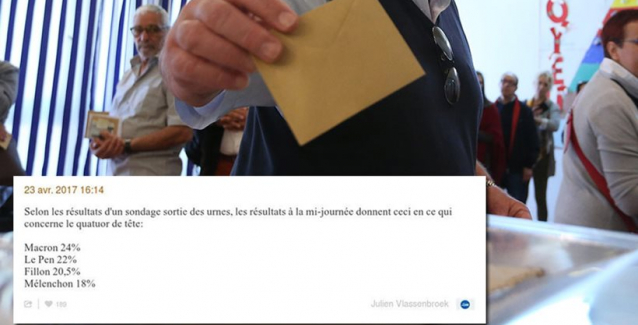 Το γαλλόφωνο βελγικό δίκτυο RTBF, το οποίο δεν δεσμεύεται από τον γαλλικό Νόμο που απαγορεύει την δημοσίευση εκτίμησης αποτελέσματος μέχρι και να κλείσουν οι κάλπες των εκλογών, κυκλοφόρησε τα πρώτα exit polls- στη μέση της ψηφοφορίας- που δείχνουν τον ανεξάρτητο κεντρώο υποψήφιο Εμανουέλ Μακρόν να προηγείται με ποσοστό 24%.