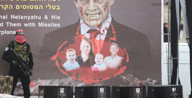 Στη Χαν Γιούνις, στο νότιο τμήμα της Λωρίδας της Γάζας, χθες νωρίς το πρωί, οπλισμένοι μαχητές της Χαμάς με κουκούλες εξέθεσαν πάνω σε εξέδρα τέσσερα μαύρα φέρετρα, το καθένα από τα οποία έφερε τη φωτογραφία καθενός από τους ισραηλινούς ομήρους. Από πάνω τους, πανό εικόνιζε τον ισραηλινό πρωθυπουργό Μπενιαμίν Νετανιάχου σαν βρικόλακα.