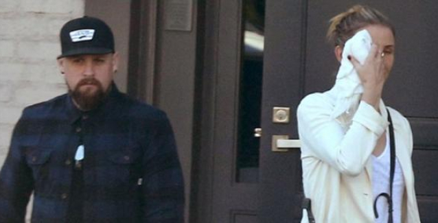 Η 44χρονη ηθοποιός περπατούσε στον δρόμο με τον σύντροφο της και κρατούσε στο χέρι της μία λευκή πετσέτα, κρύβοντας τη δεξιά πλευρά του προσώπου της καθ’ όλη τη διάρκεια της διαδρομής.