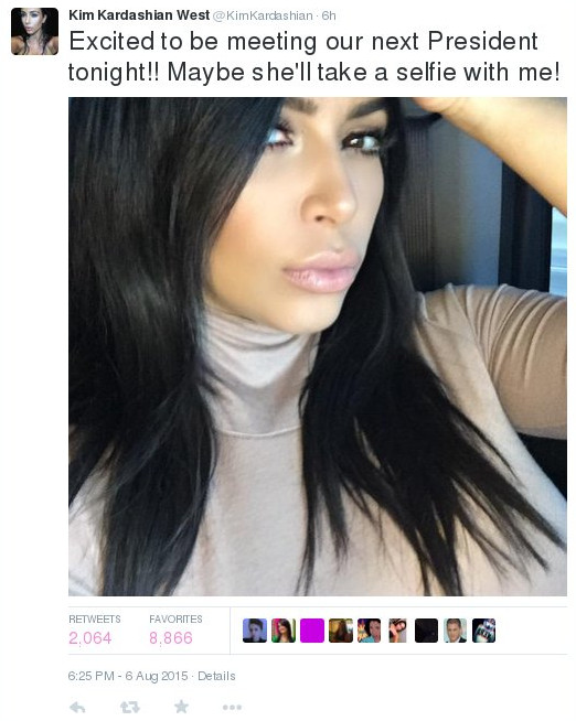 «Πήρα τη selfie μου! Λάτρεψα πραγματικά που άκουσα την ομιλία της και τους στόχους της για την χώρα μας», έγραψε η Κιμ Καρντάσιαν στο Twitter της που μαζί με τον σύζυγό της είναι θερμοί υποστηρικτές της πρώην πρώτης κυρίας της Αμερικής.