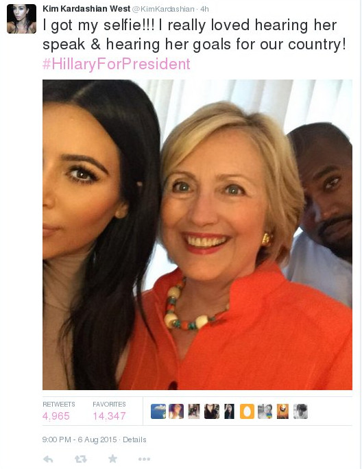 Για να αποδείξει μάλιστα του λόγου το αληθές η Χίλαρι Κλίντον την ώρα του ντιμπέιτ, έβγαζε selfies με την Κιμ Καρντάσιαν-Γουέστ. Μία από αυτές μάλιστα δημοσιεύτηκε από την ίδια την τηλεπερσόνα.