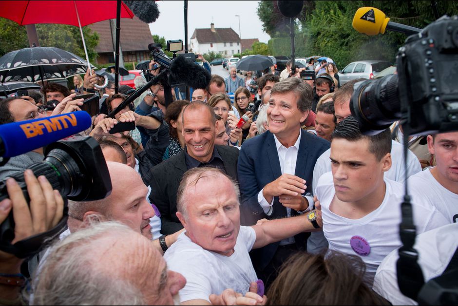 Οι δύο άνδρες πήραν μαζί το τρένο το πρωί της Κυριακής από το Παρίσι και έφτασαν στο χωριό Φρανζί εν Βρες, που βρίσκεται στην περιοχή της Βουργουνδίας. Για πρώτη φορά στη Γιορτή του Τριαντάφυλλου περίπου 80 τηλεοπτικά συνεργεία περίμεναν τον Ελληνα σταρ. Ο Μοντεμπούρ δήλωσε περήφανος που έχει στο πλευρό του τον Γιάνη Βαρουφάκη, ο οποίος, όπως δήλωσε, «πολέμησε τους ευρωπαϊκούς θεσμούς». «Είναι ο μεγάλος αυτόπτης μάρτυρας της κατάστασης στην Ευρώπη η οποία είναι πολύ άσχημη αυτή τη στιγμή», πρόσθεσε ο Μοντεμπούρ.