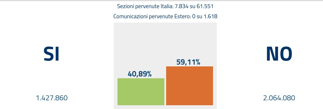 Σύμφωνα με τις εκτιμήσεις, ένα 55-59% των Ιταλών επέλεξε το «Όχι», ενώ το ποσοστό του «Ναι» φτάνει στο 41-45%. Αυτά τα ποσοστά δίνουν το La7 και η Mediaset. Προβάδισμα του «Όχι» δίνει και η RAI με εκτιμώμενο ποσοστό 54-58%, έναντι 42-46%.