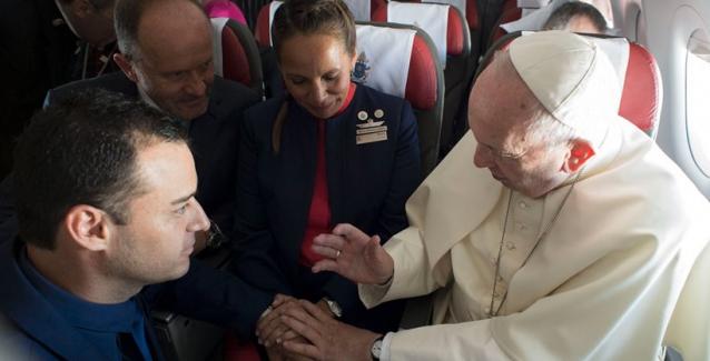 Μια ακόμη πρώτη για τον πάπα Φραγκίσκο, ο οποίος τέλεσε σήμερα τον γάμο ενός ιπτάμενου φροντιστή με μια συνάδελφό του, ενώ το παπικό αεροσκάφος πετούσε στα 11.000 πόδια, κατά τη διάρκεια μιας πτήσης μεταξύ δύο πόλεων της Χιλής.