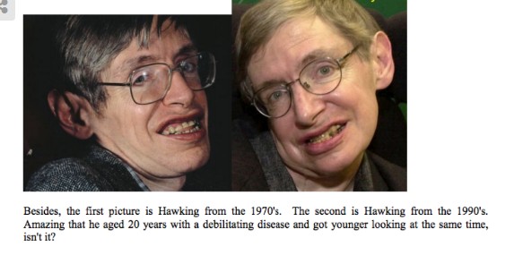 Όπως ισχυρίζεται: «Βρήκαν έναν τύπο με την ίδια μύτη και τα ίδια πεταχτά αυτιά και μας τον παρουσιάζουν σαν Hawking τα τελευταία 30 χρόνια, κατά τ’άλλα δεν μοιάζουν και πολύ.»