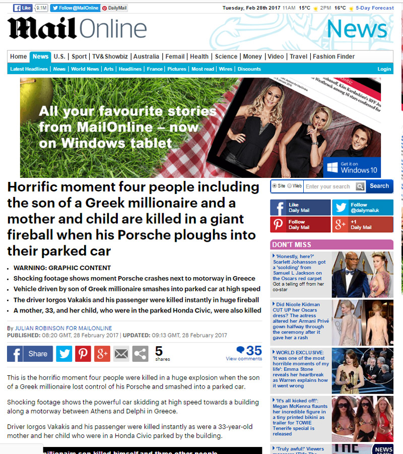 Daily Mail: «Η τρομερή στιγμή που τέσσερις άνθρωποι, στους οποίους περιλαμβάνεται ο γιος Έλληνα εκατομμυριούχου και μία μάνα με το παιδί της σκοτώνεται όταν η Πόρσε του νεαρού πέφτει πάνω στο παρκαρισμένο τους αυτοκίνητο».