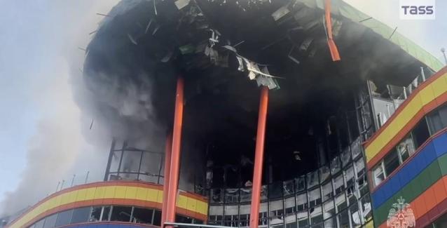 Οπτικό υλικό που μεταδόθηκε από ρωσικά ΜΜΕ εικονίζει πυκνό λευκό καπνό να αναδίδεται από το τετραώροφο εμπορικό κέντρο.