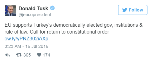 Ο Ντόναλντ Τουσκ έκανε έκκληση να επιστρέψει γρήγορα η Τουρκία στη συνταγματική τάξη, έπειτα από την απόπειρα πραξικοπήματος που σημειώθηκε στη γείτονική μας χώρα.
