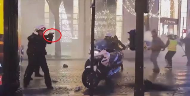 Το Σάββατο το απόγευμα στο Παρίσι, τρεις αστυνομικοί βρέθηκαν απομονωμένοι μπροστά σε πλήθος διαδηλωτών. Ο ένας από τους αστυνομικούς τράβηξε πιστόλι (φαίνεται ξεκάθαρα στο βίντεο) χωρίς, ευτυχώς, να χρησιμοποιήσει το όπλο του κάτι όμως που εξόργισε το πλήθος. Μετά από σύντομη οδομαχία, οι αστυνομικοί τράπηκαν σε φυγή ενώ το πλήθος τους ακολούθησε για λίγο πετώντας αντικείμενα προς το μέρος τους.