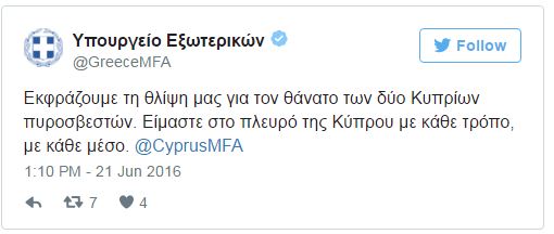 Τα θερμά συλλυπητήρια στις οικογένειες των Κύπριων πυροσβεστών, που έχασαν τη ζωή τους κατά την προσπάθεια κατάσβεσης της μεγάλης πυρκαγιάς που μαίνεται στην Κύπρο, και την αλληλεγγύη στον κυπριακό λαό για τη μεγάλη δοκιμασία που αντιμετωπίζει, εκφράζει εκ μέρους του σώματος των Ελλήνων βουλευτών ο Πρόεδρος της Βουλής των Ελλήνων κ.