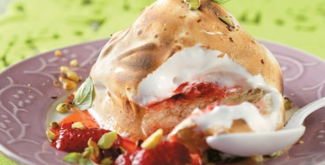 Προθερμαίνετε το φούρνο στη μεγαλύτερη θερμοκρασία, στο γκριλ. Στρώνετε ένα μικρό ταψάκι με αντικολλητικό χαρτί ψησίματος και αρχίζετε να στήνετε το γλυκό σας. Παίρνετε μια φέτα τσουρέκι, βάζετε πάνω μία δύο κουταλιές από το γλυκό του κουταλιού φράουλα και στη συνέχεια από μία μπάλα παγωτό γιαούρτι. Καλύπτετε όλη την επιφάνεια του παγωτού και του τσουρεκιού με μαρέγκα. Ψήνετε στο φούρνο για 1 λεπτό, μέχρι να πάρει χρώμα η μαρέγκα και να καραμελώσει (μπορείτε την ίδια διαδικασία να την κάνετε και με φλόγιστρο). Επαναλαμβάνετε την ίδια διαδικασία με το υπόλοιπο τσουρέκι.