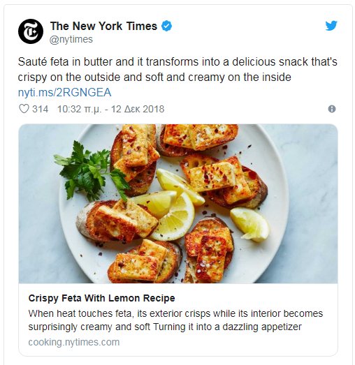 Το τμήμα Food της αμερικανικής εφημερίδας δημοσίευσε στον λογαριασμό που διατηρούν στο Twitter (και έχει 42,4 εκατομμύρια ακολούθους) τη συνταγή για τη φέτα... σωτέ!