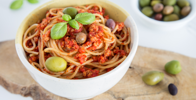Βράζουμε τα μακαρόνια σύμφωνα με τις οδηγίες της συσκευασίας. Βάζουμε το κιμά σόγιας να μουλιάσει στο ζεστό νερό.