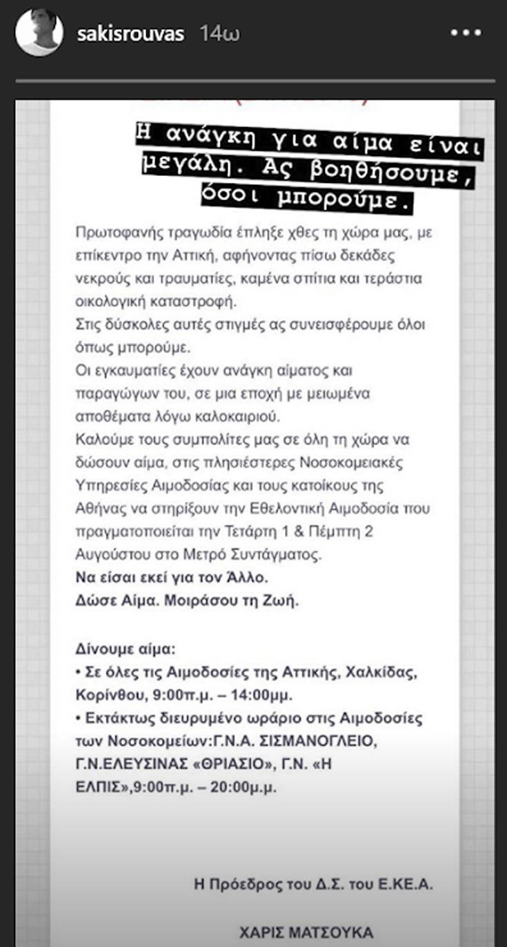 Ωστόσο, η ανάγκη για αίμα είναι μεγάλη, καθώς ο αριθμός των εγκαυματιών είναι μεγάλος κι έχουν ανάγκη αίματος και των παραγώγων τους. Και στα social media γίνονται αναρτήσεις για έκκληση βοήθειας κι ένας από αυτούς που ανέβασε σχετική ανακοίνωση είναι ο Σάκης Ρουβάς. Ο γνωστός τραγουδιστής είναι κάτοικος της περιοχής του Νέου Βουτζά και σύμφωνα με δημοσιεύματα το σπίτι του κινδύνευσε.