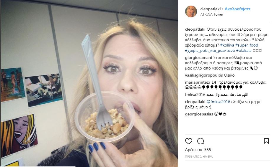 «Όταν έχεις συναδέλφους που ξέρουν τις … αδυναμίες σου!!! Σήμερα τρώμε κόλλυβα. Δυο κουπακια παρακαλώ!!! Καλή εβδομάδα είπαμε? #kolliva #super_food #χωρις_ροδι_και_μαιντανό #olakala» έγραψε στο προσωπικό της προφίλ στο Instagram ανεβάζοντας την σχετική φωτογραφία.