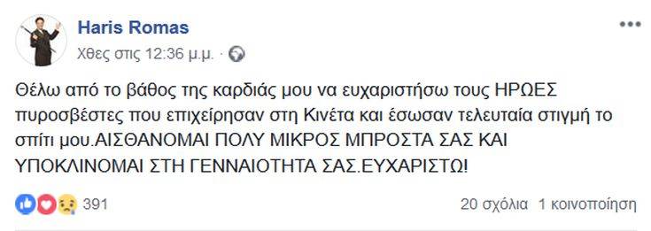 Ο γνωστός ηθοποιός Χάρης Ρώμας, μέσα από τον προσωπικό του λογαριασμό στο Facebook ευχαρίστησε τους πυροσβέστες που την τελευταία στιγμή έσωσαν το σπίτι του.