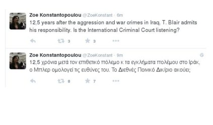 Η Ζωή Κωνσταντοπούλου μέσω του προσωπικού της λογαριασμού στο Twitter, έσπευσε να σχολιάσει τις δηλώσεις τουπρώην Βρετανού πρωθυπουργού Τόνι Μπλερ, ο οποίος μεταξύ άλλων μιλώντας στο CNN, αναγνώρισε ότι έγιναν λάθη στην στρατιωτική επιχείρηση στο Ιράκ το 2003.