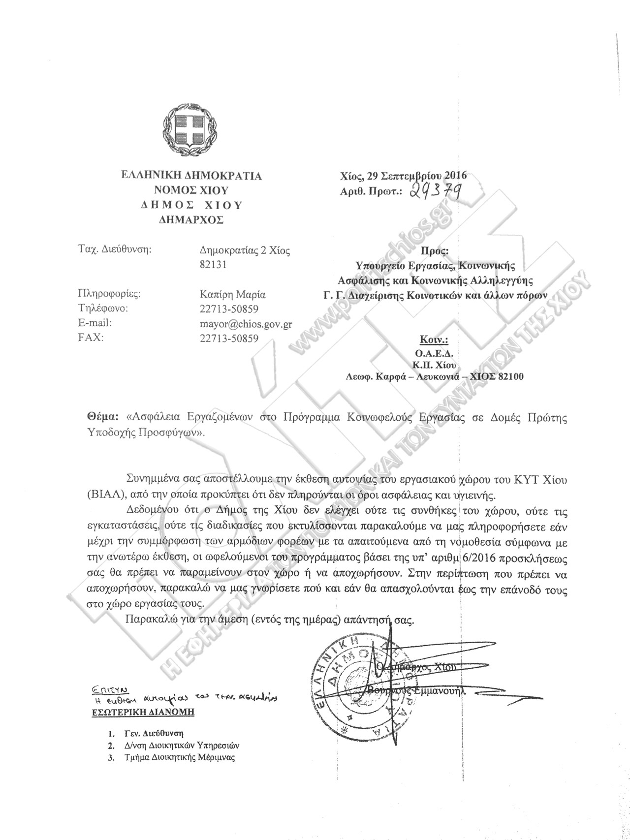 «Δεδομένου ότι ο Δήμος Χίου δεν ελέγχει ούτε τις συνθήκες του χώρου, ούτε τις εγκαταστάσεις, ούτε τις διαδικασίες που εκτυλίσσονται παρακαλούμε να μας πληροφορήσετε εάν μέχρι τη συμμόρφωση των αρμόδιων φορέων με τα απαιτούμενα από τη νομοθεσία, οι ωφελούμενοι του προγράμματος θα πρέπει να παραμείνουν στον χώρο ή να αποχωρήσουν. Στην περίπτωση που πρέπει να αποχωρήσουν, παρακαλώ να μας γνωρίσετε πού και εάν θα απασχολούνται έως την επάνοδό τους στον χώρο εργασίας τους», αναφέρει στην επιστολή του ο Δήμαρχος, χωρίς μέχρι το απόγευμα της Τρίτης να έχει λάβει κάποια απάντηση.