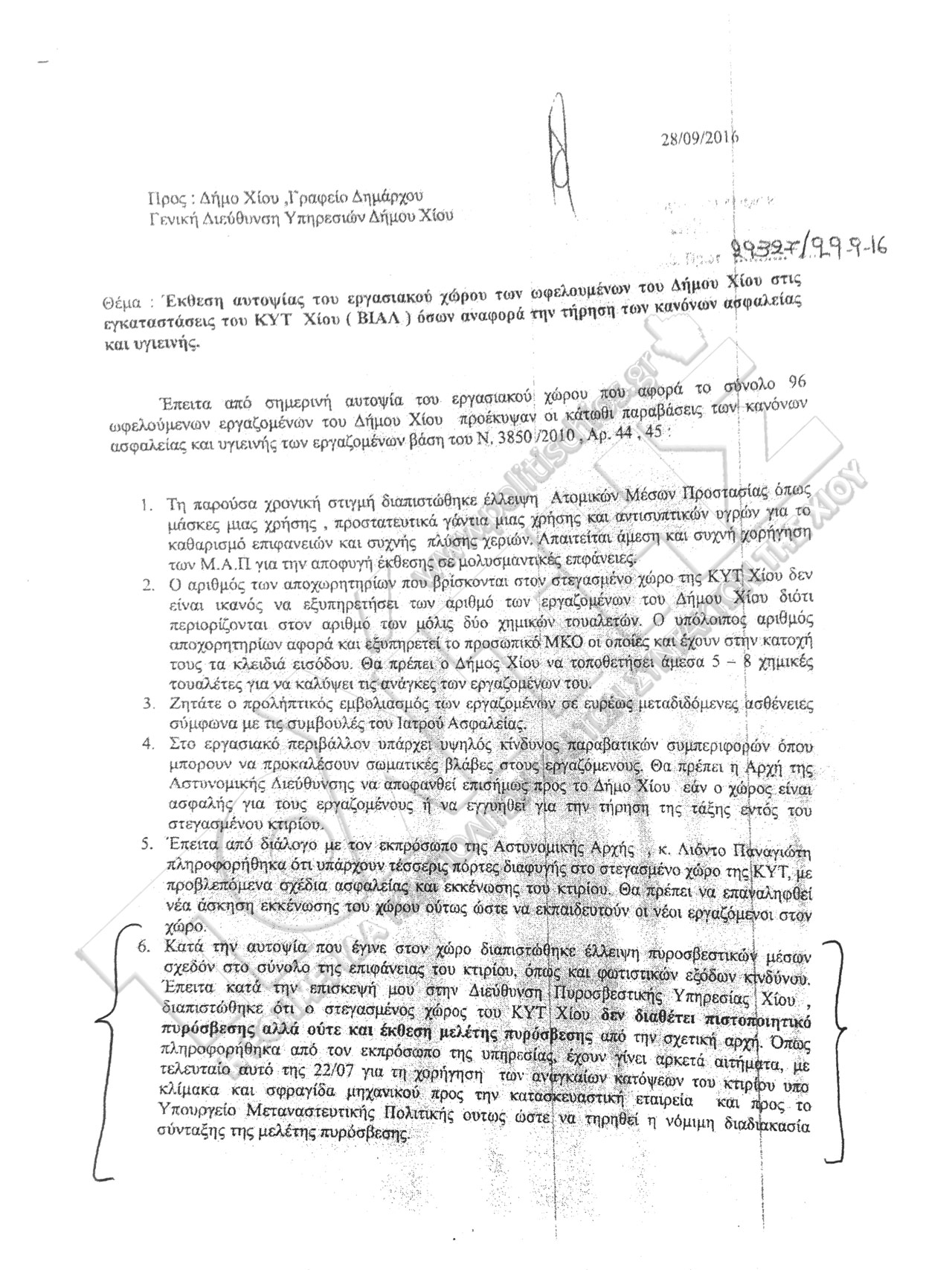 Σειρά ελλείψεων που εκθέτουν τους συμβασιούχους αλλά και μόνιμους υπαλλήλους στη ΒΙ.ΑΛ. σε κινδύνους αποτυπώνει η έκθεση του Τεχνικού Ασφαλείας του Δήμου Χίου Δ. Κωνσταντινίδη.