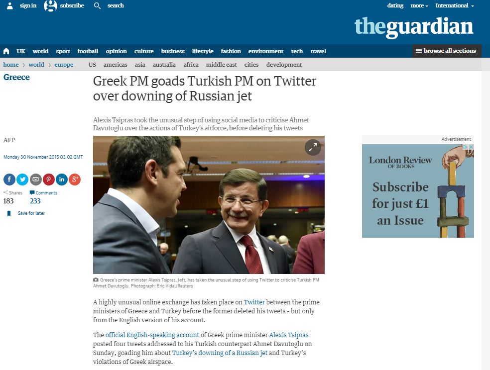 Ο αρθρογράφος επιμένει σε δύο σημεία: Πως το συμβάν θεωρείται «πάρα πολύ ασυνήθιστο» και πως ο Έλληνας πρωθυπουργός έσβησε μόνο από τον αγγλόφωνο λογαριασμό του τα επίμαχα tweets. Στέκεται επίσης στο γεγονός πως ο Τσίπρας δεν διευκρίνισε εάν τα όσα μετέφερε στο Twitter του ειπώθηκαν μέσα στην Σύνοδο ή εάν γράφτηκαν ειδικά για τα social media. «Πολύ γρήγορα άναψε φωτιά στο Twitter, καθώς πολλοί χρήστες καταδίκασαν τον Αλέξη Τσίπρα για την διεξαγωγή ενός τέτοιου διαλόγου, με κάποιους πάντως να τον υποστηρίζουν», σημειώνει ο Guardian. Guardian: Ο Έλληνας πρωθυπουργός «την πέφτει» στον Τούρκο στο Twitter για την κατάρριψη του ρωσικού τζετ