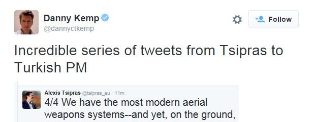 Άσχημη εντύπωση προκάλεσε το χθεσινό «επεισόδιο» στο Twitter μεταξύ του Έλληνα πρωθυπουργού Αλέξη Τσίπρα και του Τούρκου ομολόγου του Αχμέτ Νταβούτογλου στα διεθνή μέσα ενημέρωσης καθώς τελικά τα επίμαχα tweet "κατέβηκαν" δημιουργώντας έτσι την εντύπωση ότι η ελληνική ηγεσία φοβήθηκε τις αντιδράσεις.