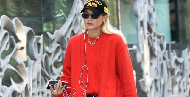 Πάνω από αυτό η Gigi Hadid φόρεσε μια εξίσου κόκκινη ζακέτα για μια απλή αλλά σούπερ εντυπωσιακή εμφάνιση κατά τη διάρκεια της ημέρας.