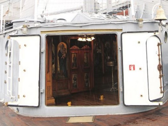 Aξίζει να σημειώσουμε ότι ο ιερέας του είχε πολύ σημαντικό έργο. Στις επιχειρήσεις ήτανε στα λεβιτοστάσια και στα μηχανοστάσια και εμψύχωνε τον κόσμο και όταν καθόταν το καράβι σε λιμάνι ήρεμο έπαιρνε τα ναυτάκια που στο μεγαλύτερο ποσοστό ήταν αναλφάβητα και τους μάθαινε γραφή. Μπορούμε να πούμε ότι ο ιερέας είναι μια εμβληματική παρουσία σε όλη την ιστορία του πλοίου και μπορούμε να πούμε αβίαστα ότι ο,τι έχει κάνει αυτό το πλοίο στην ιστορία του συνυπάρχει το ηρωικό και το θείο.