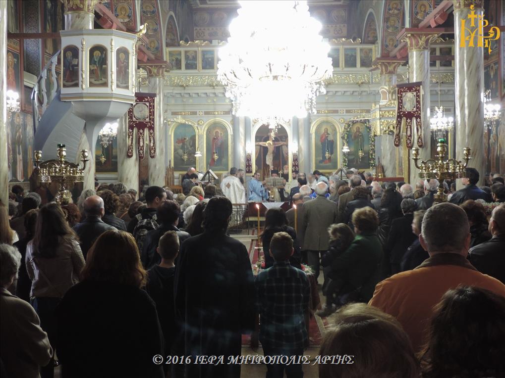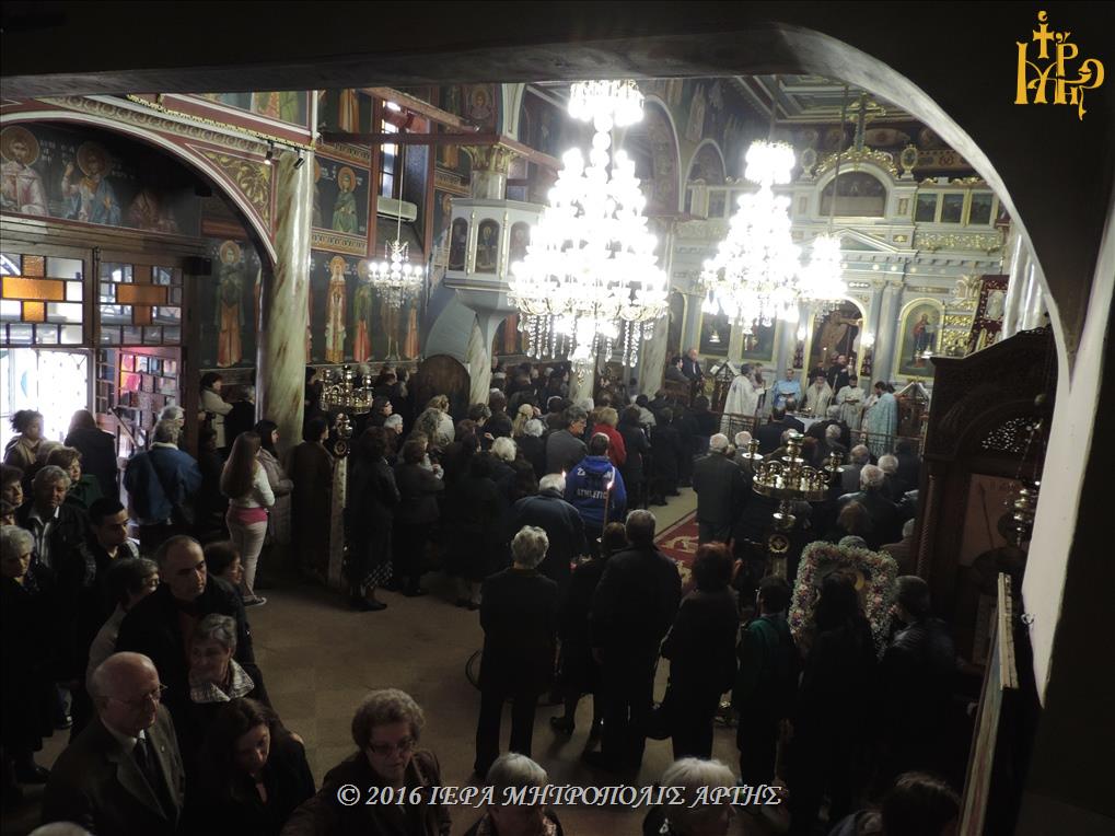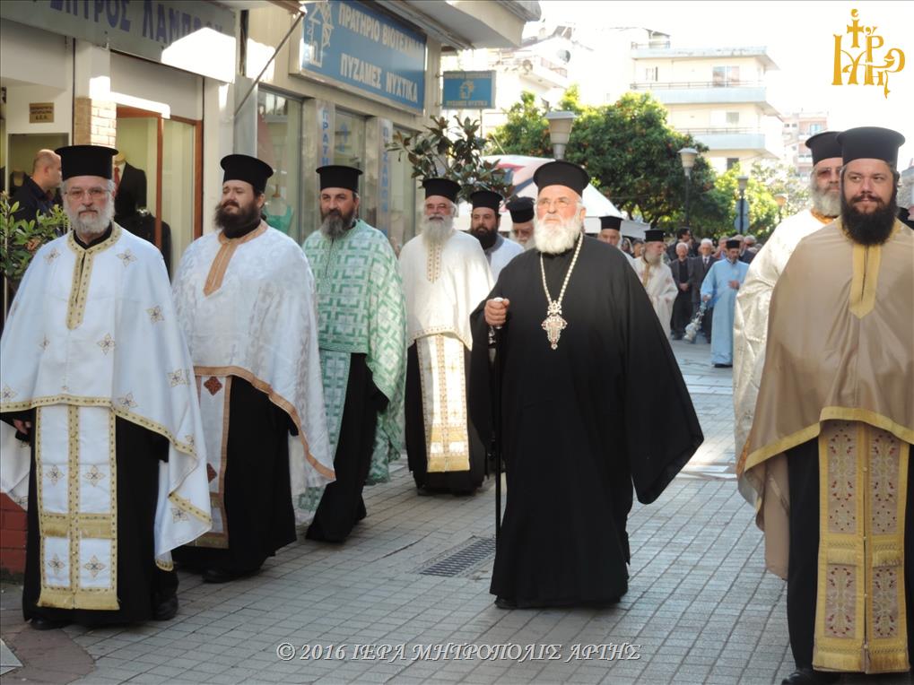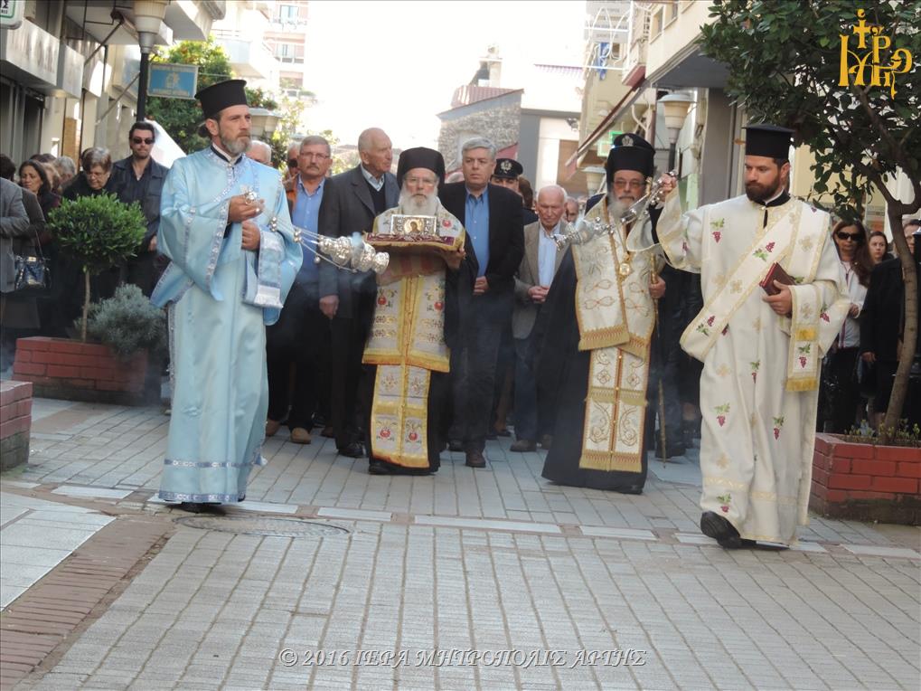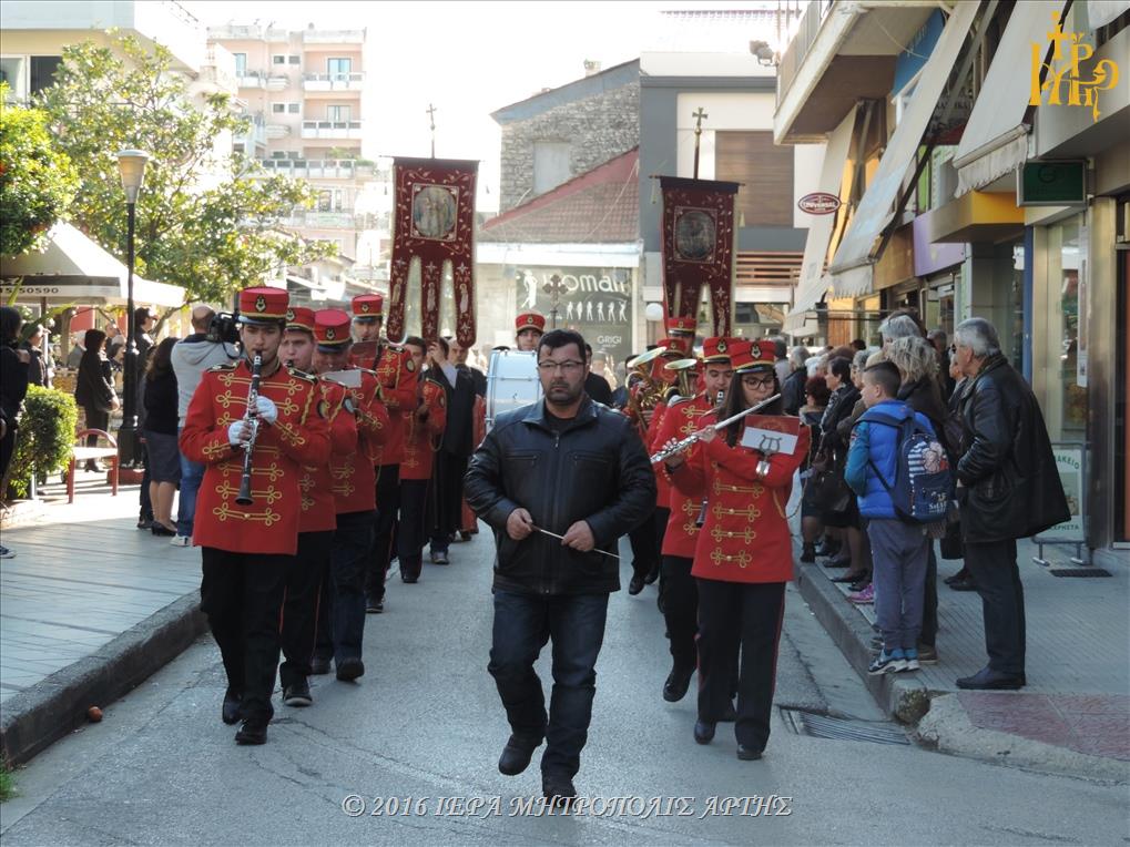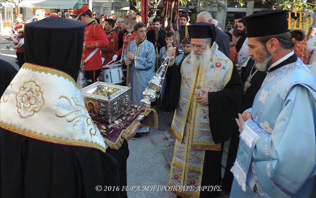 Το Ιερό λείψανο υποδέχθηκε ο Σεβασμιώτατος Μητροπολίτης Άρτης κ. Ιγνάτιος, στην πλατεία Μονοπωλίου, μετά του Κλήρου, των Αρχόντων και πολλών ευσεβών χριστιανών. Εν πομπή το άγιο προσκύνημα έφτασε στον Ιερό Ναό του Αγίου Γεωργίου όπου τελέσθηκε το Μυστήριο του Ιερού Ευχελαίου.