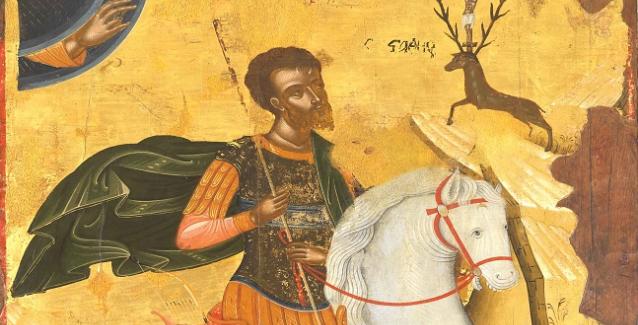 Ονομαζόταν προηγουμένως Πλακίδας και η γυναίκα του Τατιανή. Αυτός λοιπόν ο αοίδιμος, επειδή ήταν υποδουλωμένος στην πλάνη των ειδώλων, εξ αίτιας της μεγάλης του ευλάβειας και καλοκαγαθίας αξιώθηκε να κληθεί στην πίστη από τον Θεό, όπως και ο Απόστολος Παύλος Διότι μία φορά, που αυτός κυνηγούσε και καταδίωκε ένα μεγάλο ελάφι και αρκετά το πλησίασε, ω του θαύματος!, βλέπει ανάμεσα στα δυο κέρατα του ελαφιού να στέκεται, ο τίμιος Σταυρός του Χριστού, ο οποίος έλαμπε περισσότερο από τον ήλιο.
