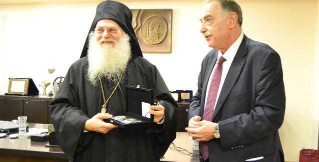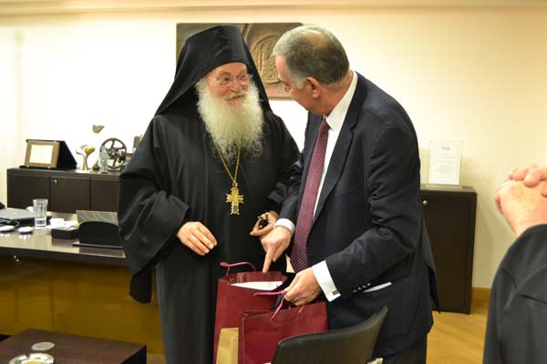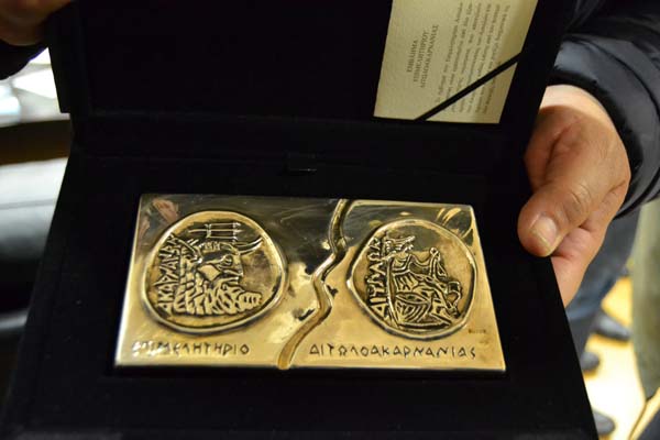 Ο πρόεδρος του Επιμελητηρίου Παναγιώτης Τσιχριτζής παρέδωσε στον Γέροντα μεταλλικά αντίγραφα των αρχαίων νομισμάτων της περιοχής ως ενθύμιο της επίσκεψης.