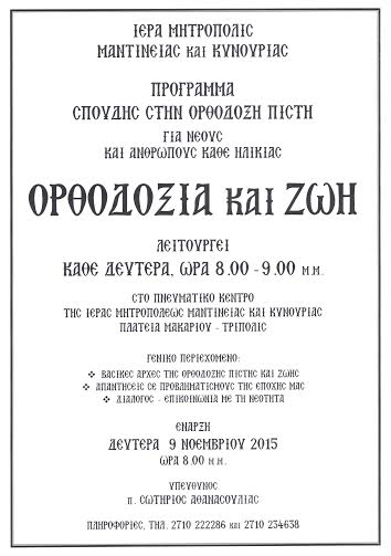 Η Ιερά Μητρόπολις Μαντινείας και Κυνουρίας, κάνει γνωστό ότι, στα πλαίσια του ποιμαντικού και διδακτικού έργου της, λειτουργεί και φέτοςτο ειδικό Πρόγραμμα Σπουδής στην Ορθόδοξη πίστη, με τίτλο «ΟΡΘΟΔΟΞΙΑ  ΚΑΙ  ΖΩΗ».