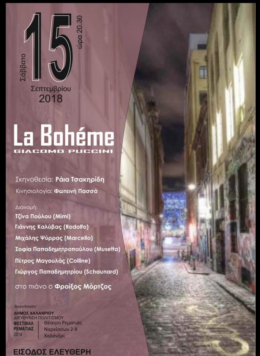 Η Όπερα "La Boheme" του G.Puccini, πλαισιωμένη από λυρικούς καλλιτέχνες της Εθνικής Λυρικής Σκηνής και πιανίστα του δυναμικού της Λυρικής επίσης.