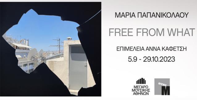 Άνοιξε για το κοινό η μονογραφική δοκιμιακή έκθεση Free from what της Μαρίας Παπανικολάου που διοργανώνεται από το Μέγαρο Μουσικής Αθηνών στην Υπηρεσιακή Αυλή στο πλαίσιο του καλοκαιρινού εικαστικού προγράμματος του annexM υπό την επιμέλεια της Άννας Καφέτση.