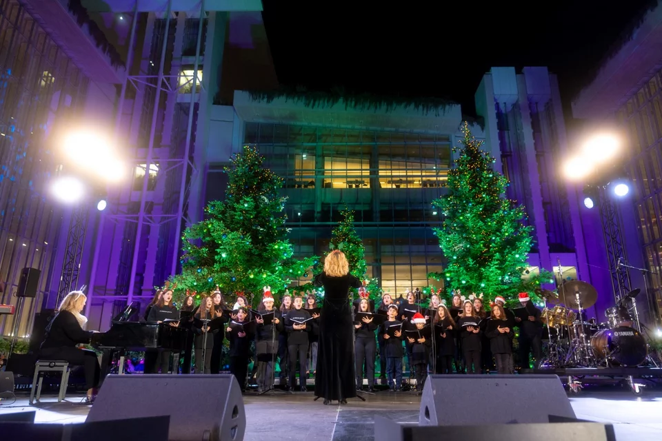 Η βραδιά ξεκίνησε με τη χορωδία νέων του El Sistema Greece, υπό τη διεύθυνση της Βάγιας Παπαγιαννοπούλου, που τραγούδησε παραδοσιακά κάλαντα και άλλα γνωστά χριστουγεννιάτικα τραγούδια.
