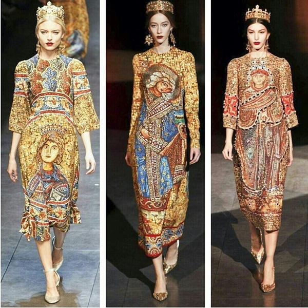 Πολύτιμα φορέματα εμπνευσμένα από το Βυζάντιο από τη Chanel και τους Dolce& Gabbana, ο κήπος της Εδέμ σε μια εκδοχή υψηλής ραπτικής από τον Valentino, ένας μανδύας καρδιναλίου σε βραδινή εκδοχή από τον οίκο Balenciaga.