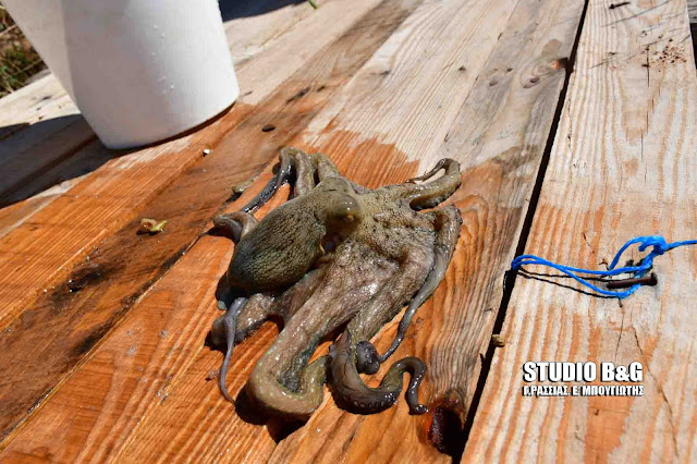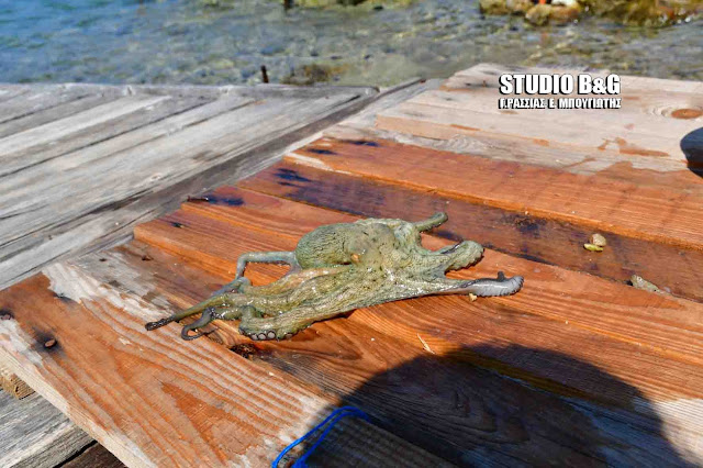 Δεν πίστευαν στα μάτια τους όσοι έκαναν το μπάνιο τους στην παραλία Καραθώνας στο Ναύπλιο σήμερα το πρωί όταν είδαν ένα χταπόδι να βγαίνει έξω και να κόβει βόλτες σε μία ξύλινη προβλήτα.
