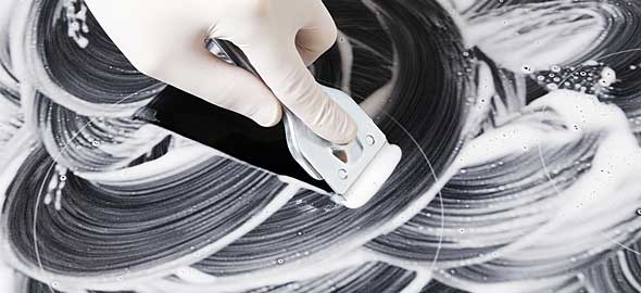 Συνήθως είναι άσπρο υγρό, όχι ιδιαίτερα παχύρευστο και συνοδεύεται από ειδική ξύστρα απομάκρυνσης ξεραμένων λιπών και υπολειμμάτων τροφών. Ξύστε σε κρύα επιφάνεια εστίας με την ειδική ξύστρα για να απομακρύνεται όλα τα υπολείμματα τροφών και ξεραμένων λιπών. Απομακρύντε τα με ένα νωπό πανί, προσεκτικά μην χαράξτε την επιφάνεια των εστιών.