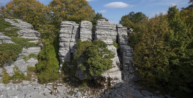 Η εικόνα γίνεται ακόμη πιο όμορφη και ξεχωριστή καθώς το πέτρινο δάσος βρίσκεται στην ουσία μέσα σε ένα κανονικό δάσος αποτελούμενο από δρύες και σφένδαμους.