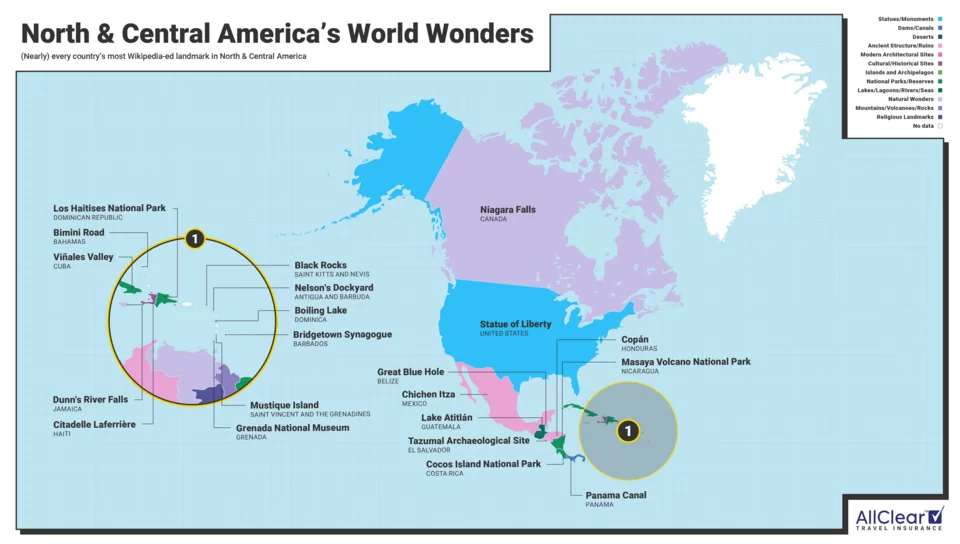Η Βόρεια και Κεντρική Αμερική φιλοξενούν μια φανταστική ποικιλία από αξιοθέατα, με έναν πλούσιο κατάλογο κορυφαίων σποτς, όπως πάρκα και καταφύγια, φυσικά θαύματα, λίμνες, αγάλματα και αρχαία. Οι τουρίστες που επιθυμούν να τσεκάρουν μερικά αξιοθέατα που αξίζουν τον τίτλο του παγκόσμιου θαύματος μπορούν να κατευθυνθούν στην απομακρυσμένη κοιλάδα Viñales της Κούβας, στη Μεγάλη Γαλάζια Τρύπα του Μπελίζ, στην εκπληκτική ηφαιστειακή λίμνη Atitlán της Γουατεμάλας ή ακόμη και στον μυστηριώδη δρόμο Bimini στις Μπαχάμες.