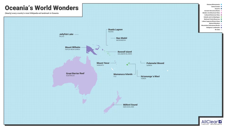 Η Ωκεανία προσφέρει πληθώρα φυσικών θαυμάτων, λιμνών και νησιών αλλά στην κορυφή βρίσκεται ο Μεγάλος Κοραλλιογενής Ύφαλος της Αυστραλίας, το Nan Madol της Μικρονησίας (μια αρχαία, ερειπωμένη πόλη χτισμένη πάνω σε τεχνητά νησιά) και το Milford Sound της Νέας Ζηλανδίας, ένα φιορδ με εντυπωσιακά τοπία. Στον κατάλογο περιλαμβάνονται επίσης μερικά λιγότερο γνωστά αλλά φανταστικά φυσικά θαύματα, όπως η λίμνη με τις μέδουσες του Παλάου, τα νησιά Μαμανούκα των Φίτζι και το όρος Γιασούρ του Βανουάτου (ενεργό ηφαίστειο).