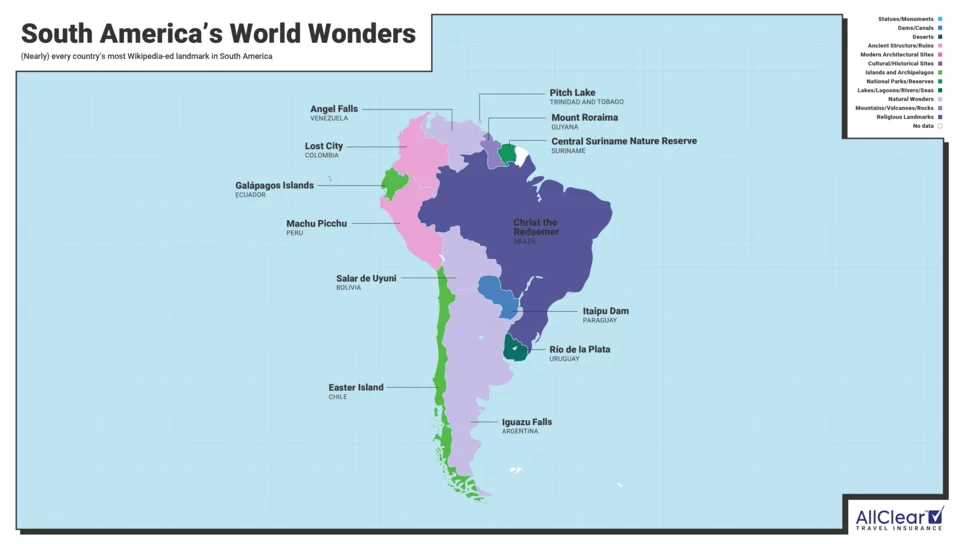 Μεγάλη ποικιλία και στα κορυφαία σποτ της Νότιας Αμερικής, από τα φυσικά θαύματα, όπως οι παγκοσμίου φήμης αλυκές Salar de Uyuni της Βολιβίας και τα εκπληκτικά νησιά Γκαλαπάγκος του Ισημερινού, μέχρι τον αρχαίο αρχαιολογικό χώρο Ciudad Perdida της Κολομβίας και τους καταρράκτες Ιγκουαζού της Αργεντινής. Στον κατάλο περιλαμβάνεται επίσης ο Λυτρωτής Χριστός στη Βραζιλία.