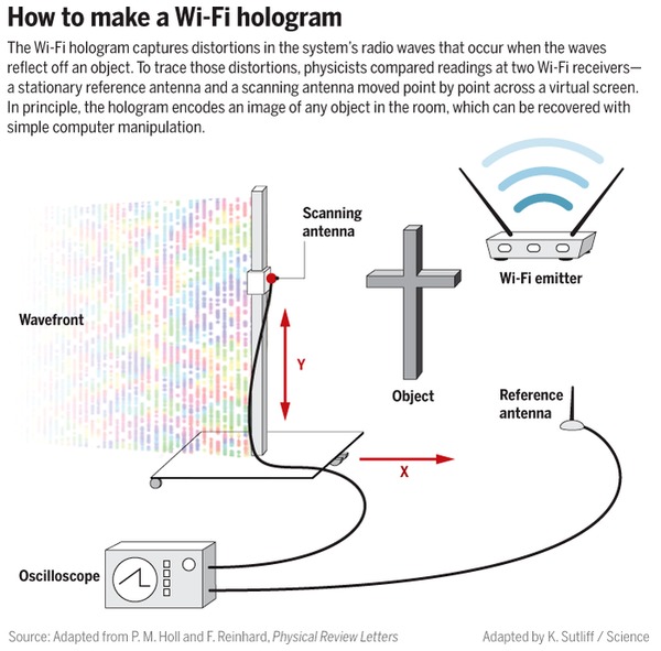 Γερμανοί ερευνητές έδειξαν για πρώτη φορά ότι είναι δυνατό να χρησιμοποιήσει κάποιος τα ραδιοκύματα της ασύρματης μετάδοσης (Wi-Fi) για να δημιουργήσει μια τρισδιάστατη εικόνα με μορφή ολογράμματος ενός αντικειμένου, που βρίσκεται μέσα σε ένα κλειστό χώρο κοντά στο router.