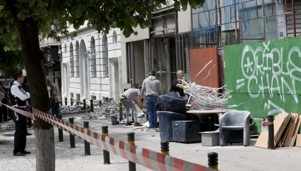 Συνεργεία αποκατάστασης μαζεύουν τα συντρίμμια έξω από τα κτίρια της τράπεζας στην οδό Σανταρόζα, όπου έγινε χθες η έκρηξη βόμβας.