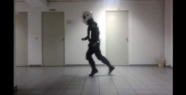 Σε αυτό ένας άντρας με στολή και κράνος, κάνει moonwalking, τη διάσημη χορευτική φιγούρα που έκανε ο Μάικλ Τζάκσον.