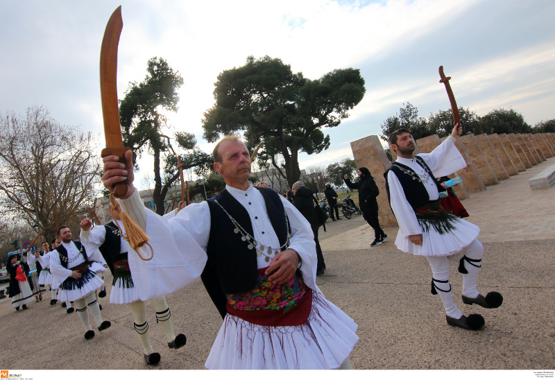 Με παραδοσιακά μουσικά όργανα, κραδαίνοντας στον αέρα τα σπαθιά τους και χορεύοντας δημιούργησαν ένα γιορτινό κλίμα.